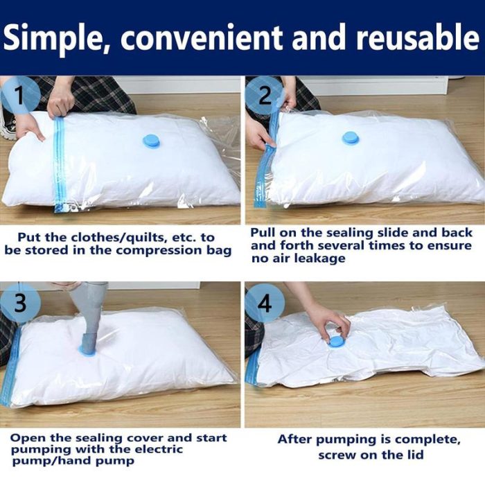 【Vacuum Storage Bags】: Our vacuum storage bags combo includes 6 pack vacuum compression bags.Including 2 jumbo (31.5″ X 39.37″),4 large (23.62″ X31.5″) and 4 medium (19.68″ X 27.56″). Can store away your blankets, bed sheets, clothing and more. Pump Included. Our vacuum storage bags are compatible with standard vacuum cleaners. Simply place your items in the bag, seal the zipper, use the vacuum cleaner to suck out the air, and close the lid.